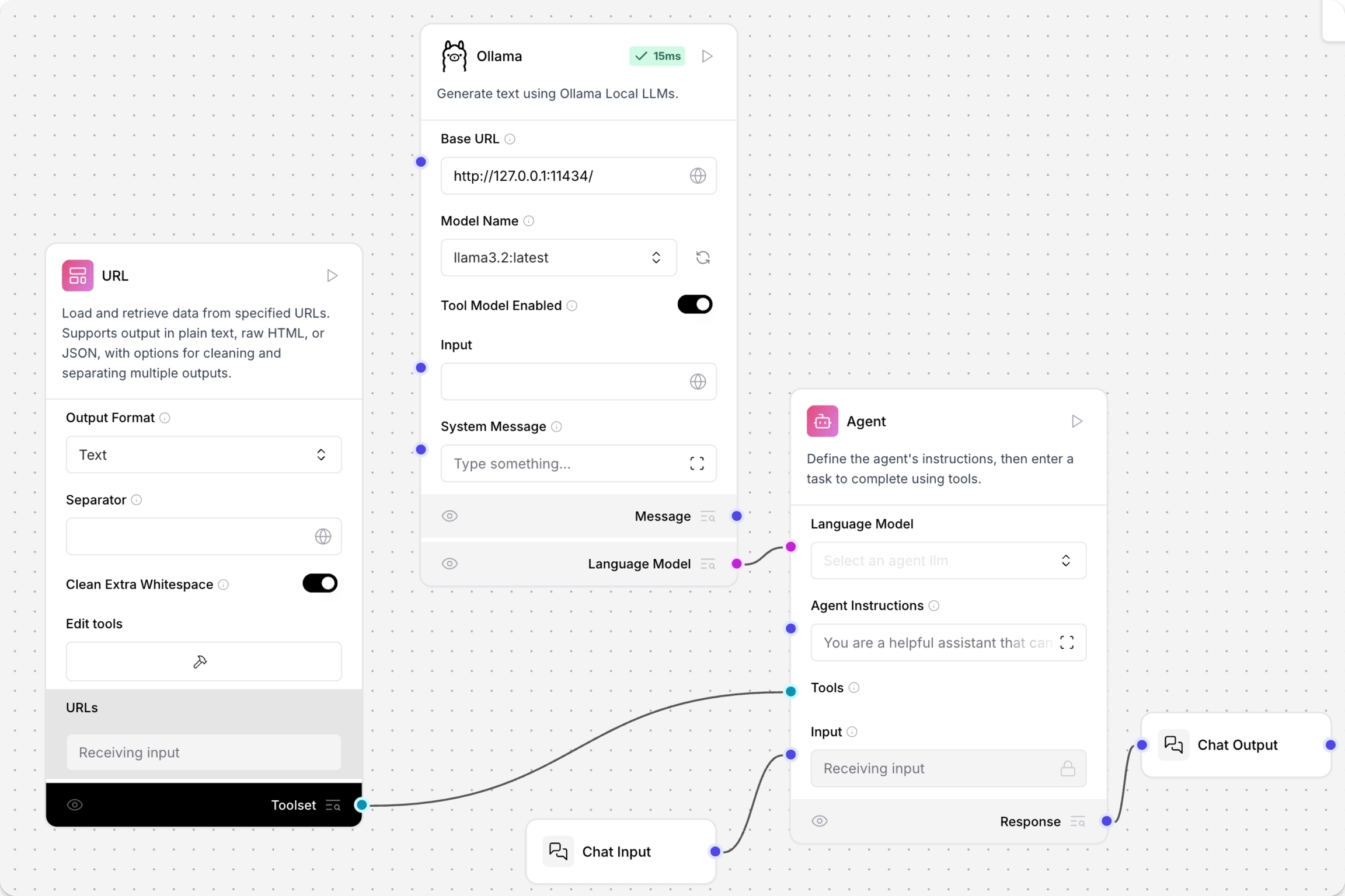llama3.2:latest.Connect the Ollama model component to a flow. For example, this flow connects a local Ollama server running a Llama 3.2 model as the custom model for an Agent component.