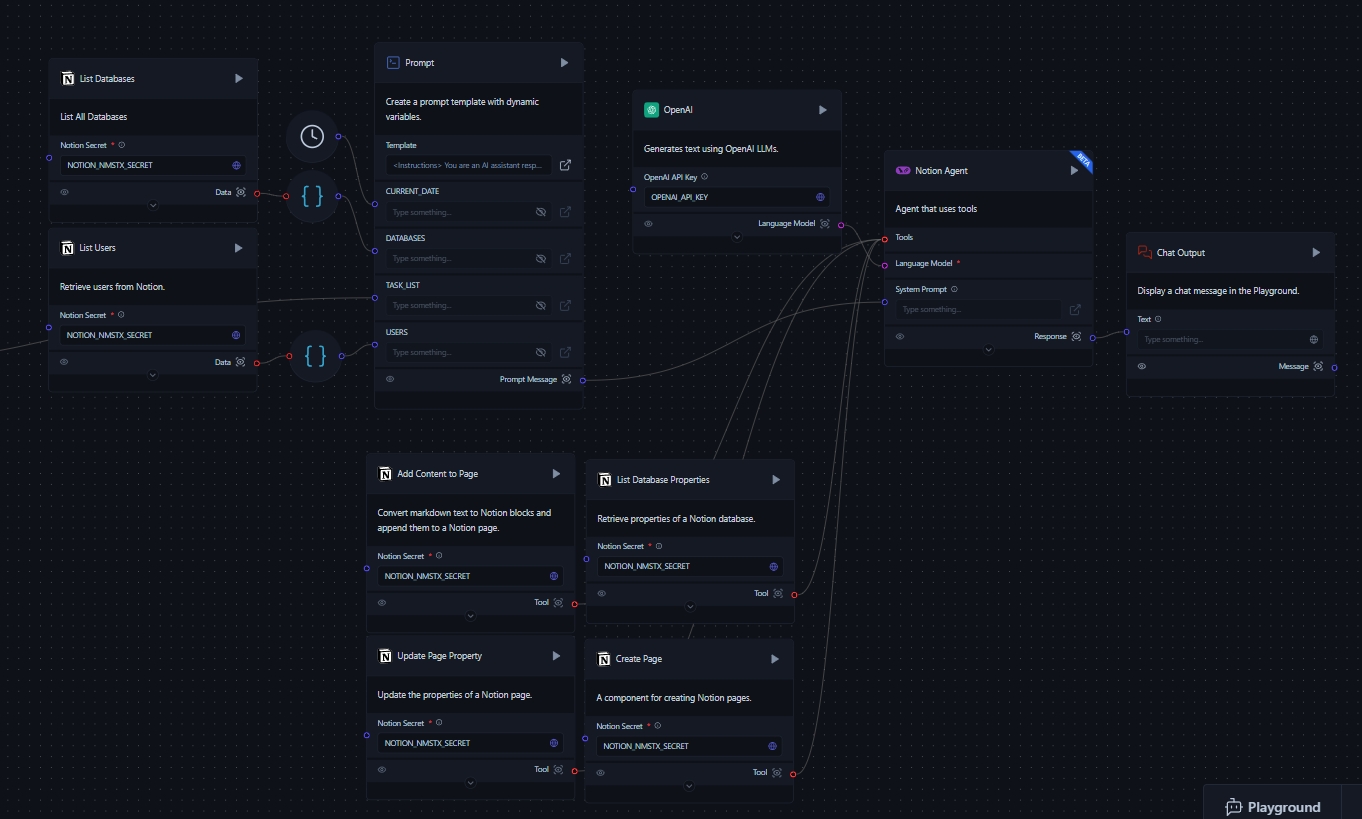 Review the output in the Chat Output component, which will summarize the actions taken in your Notion workspace.